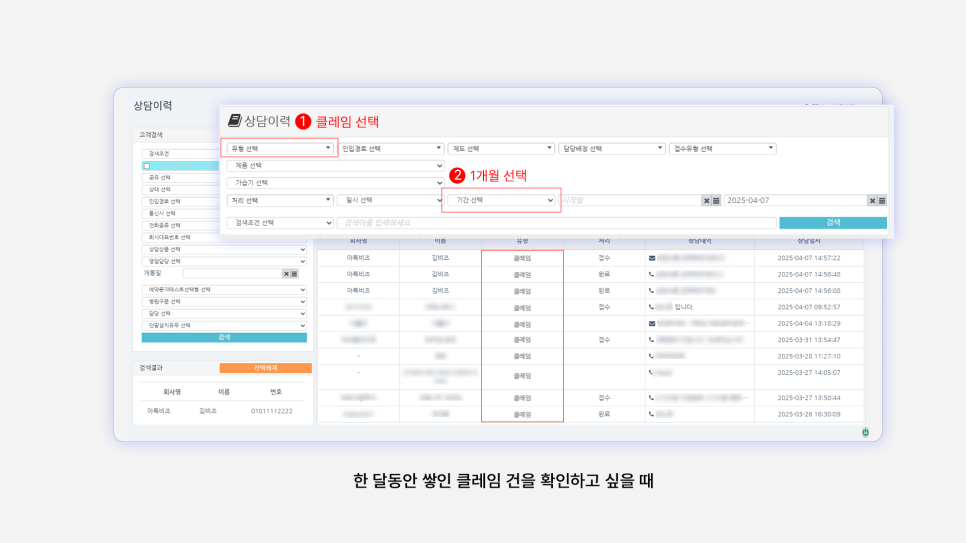 [상담 유형]을 클레임으로 + 기간을 1개월로 선택하여 검색