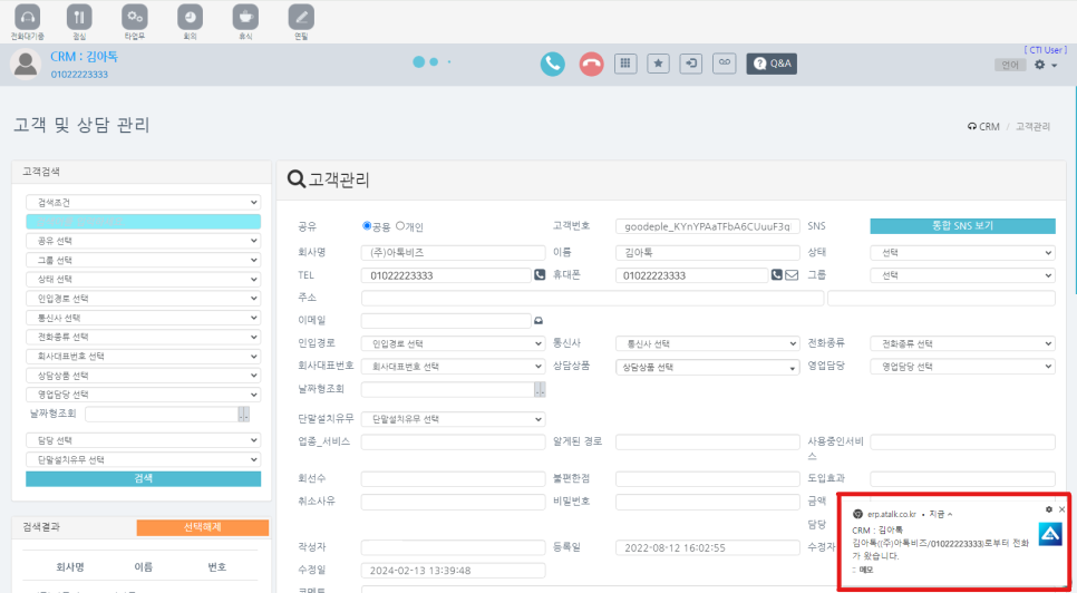 • 기존 고객이 전화를 걸었을 때, 화면 하단에 팝업창이 뜨고, 이 팝업을 클릭했을 때 고객 정보 및 상담 이력을 확인할 수 있습니다.