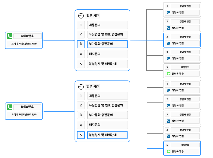 ① 두 개 브랜드를 운영중이라 브랜드 전화번호별로 ARS 안내멘트를 설정하고 싶어요.